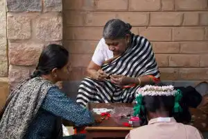 The children who come from urban, uppermiddle class backgrounds are used to having people from less privileged backgrounds work for them, as domestic helps and drivers, etc. The space of the craft week challenges this paradigm and reverses it. The children who have never worked with their hands before or aren’t used to it, are taught patiently by the skilled craftspeople. The latter often come from underprivileged communities. As the rural artisans take the role of educators, and the children learn from them, old conditionings are challenged.